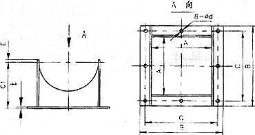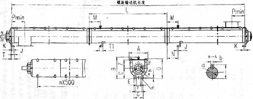 注:1、螺旋機(jī)輸送長(zhǎng)度及尺寸L均見表二、表三。 2、圖n×500為蓋板卡子尺寸,n值視螺旋機(jī)長(zhǎng)度而定。 3、圖中尺寸p為進(jìn)出料口中心線。