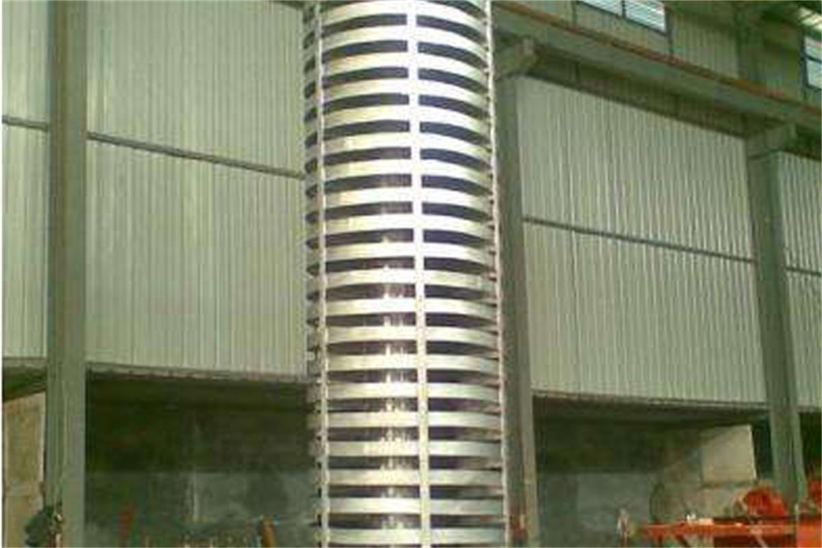 垂直振動輸送機是通過激振器強迫振動,使輸送塔作沿垂直方向的直線振動和繞鉛垂中心軸的扭動振動,兩個振動的合成,使物料朝 螺旋運動的方向斜拋,形成了物料沿螺旋槽向上的輸送過程。垂直振動輸送機是由提升槽、振動電機、減振系統(tǒng)和底座等組成。垂直振動輸送機分開槽式、封閉式兩種結(jié)構(gòu)。